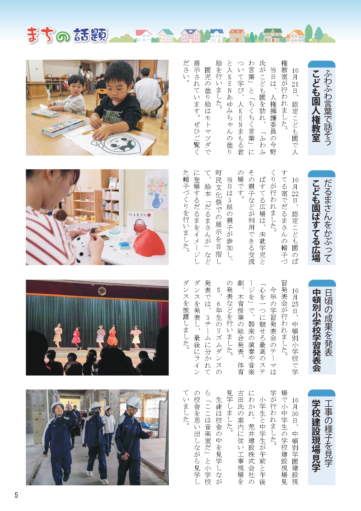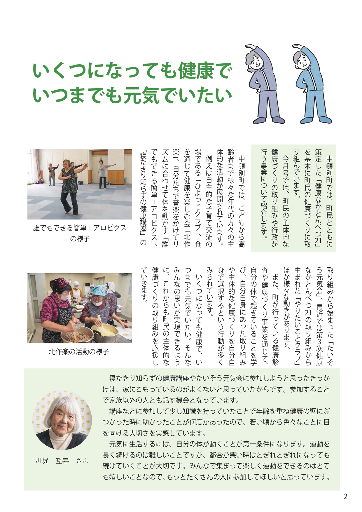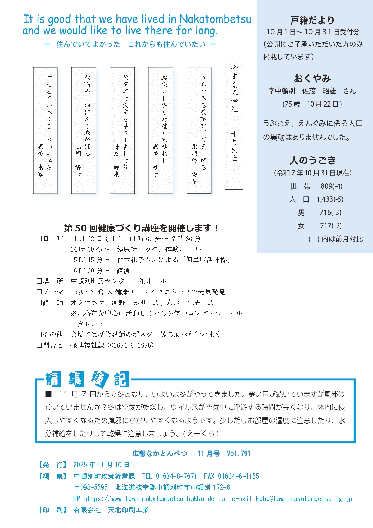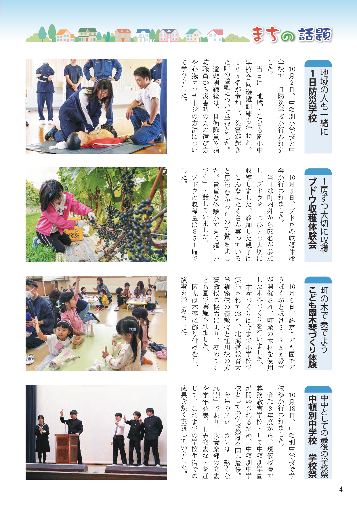 広報なかとんべつ2025年11月発行号 Home > 広報 > 広報なかとんべつ > 2025年度 広報なかとんべつ > 広報なかとんべつ2025年11月発行号 電子版はこちらから(Hokkaido ebooks) ページ 内容 広報なかとんべつ2025年9月発行号 表紙:頓別川で釣り・魚とり体験&観察会の様子 791-1 特集:中頓別町の自然体験学習「森のこども園」と「ピンネっこクラブ」 791-2-3 まちの話題 791-4-5 インフォメーション 791-6-7 第8期総合計画 町民アイデア「7つのアクション」活動便り 791-8 ダリン&タイラーのALT通信 791-9 ワインづくりへの挑戦 791-10 図書室だより 791-11 裏表紙 やまなみ吟社 791-12 2025年度 広報なかとんべつ
