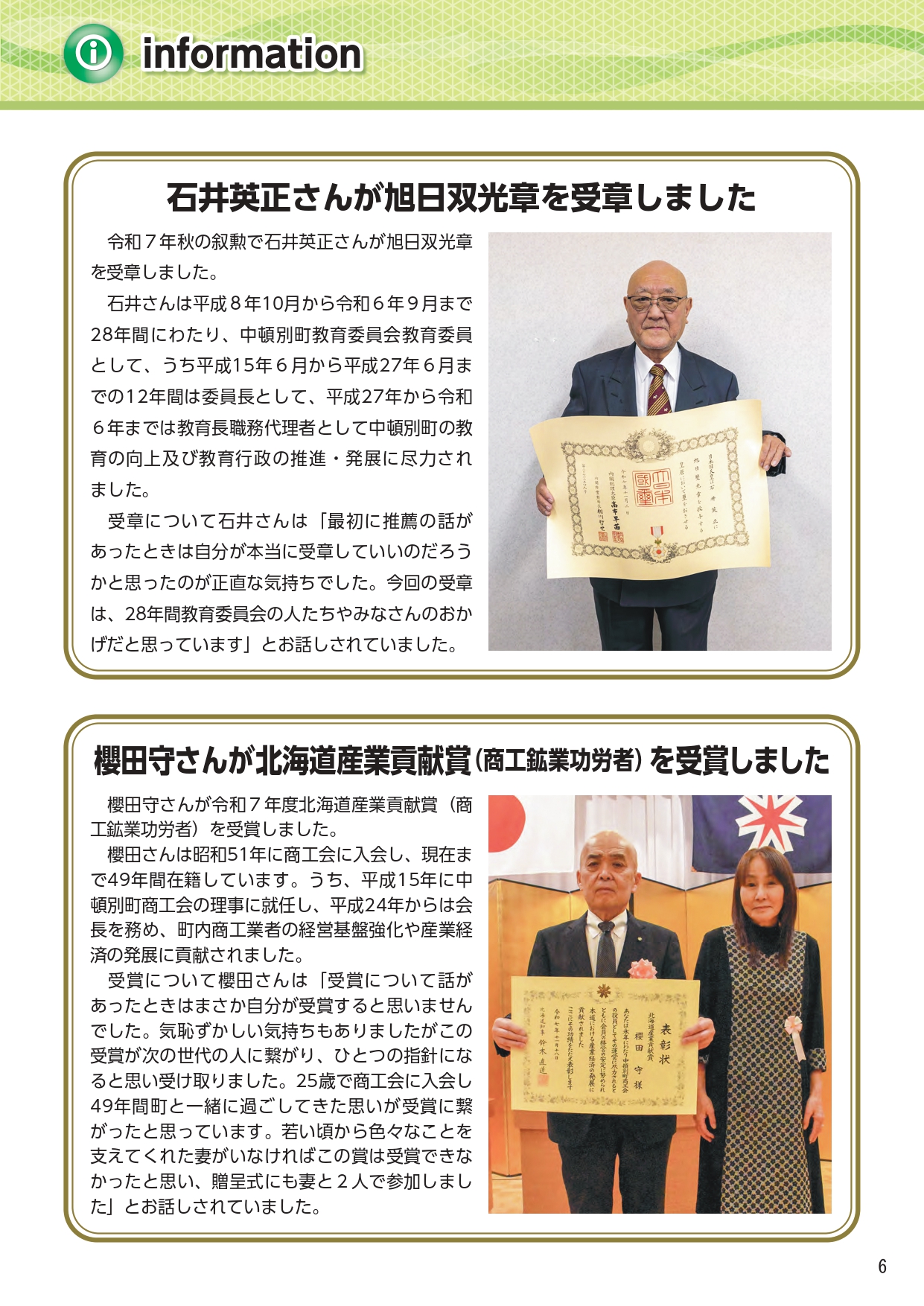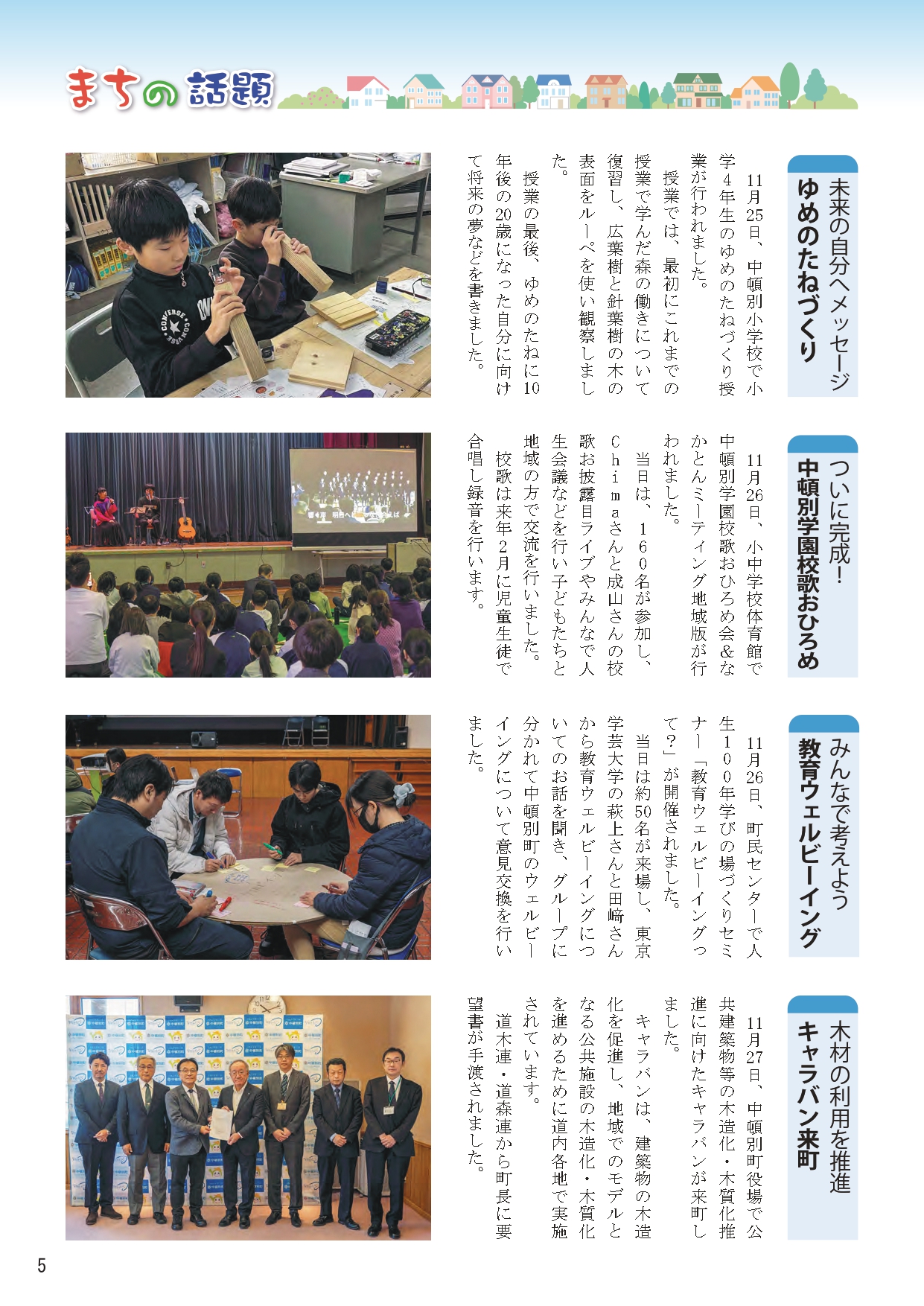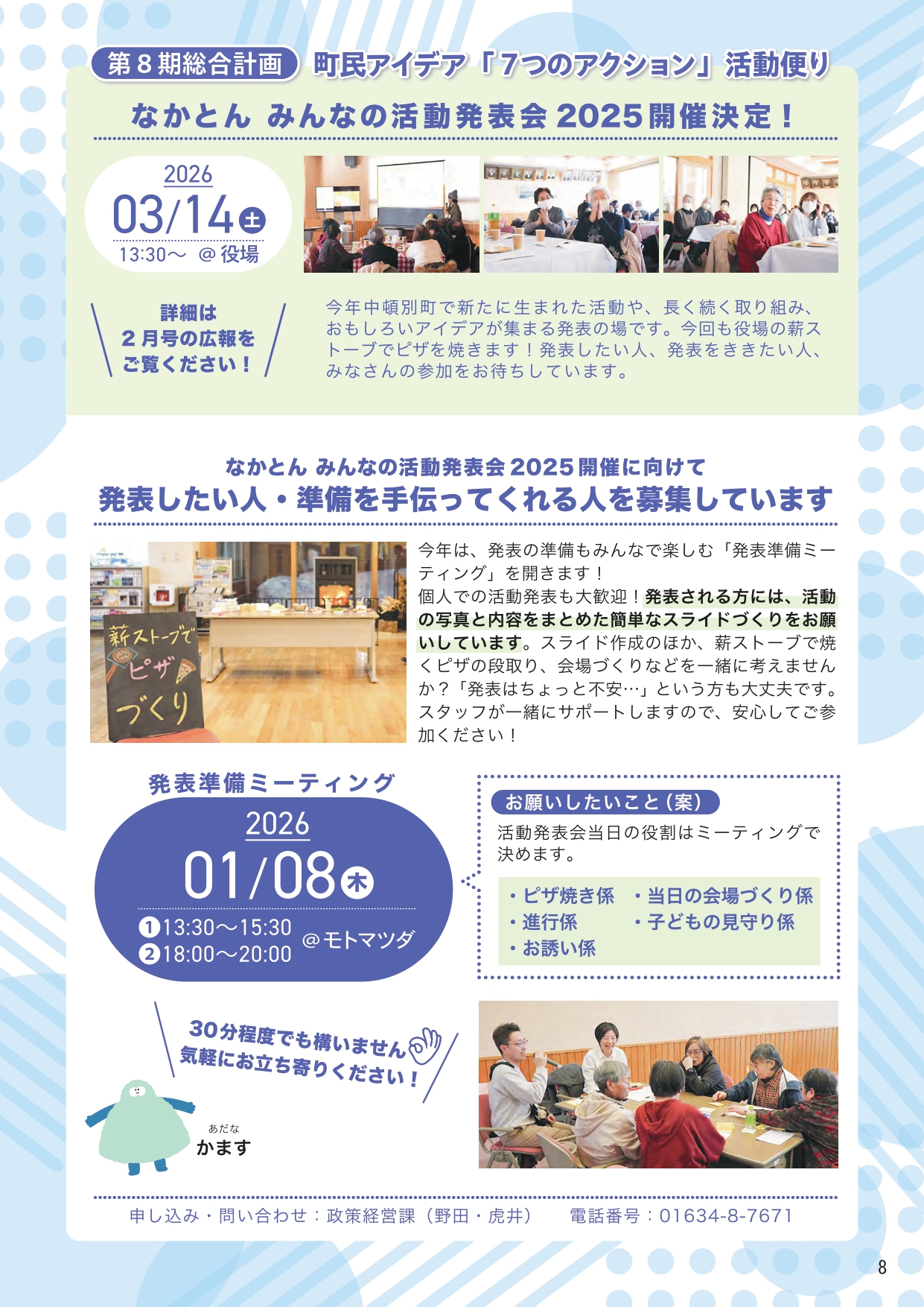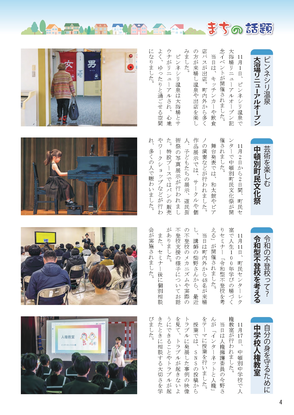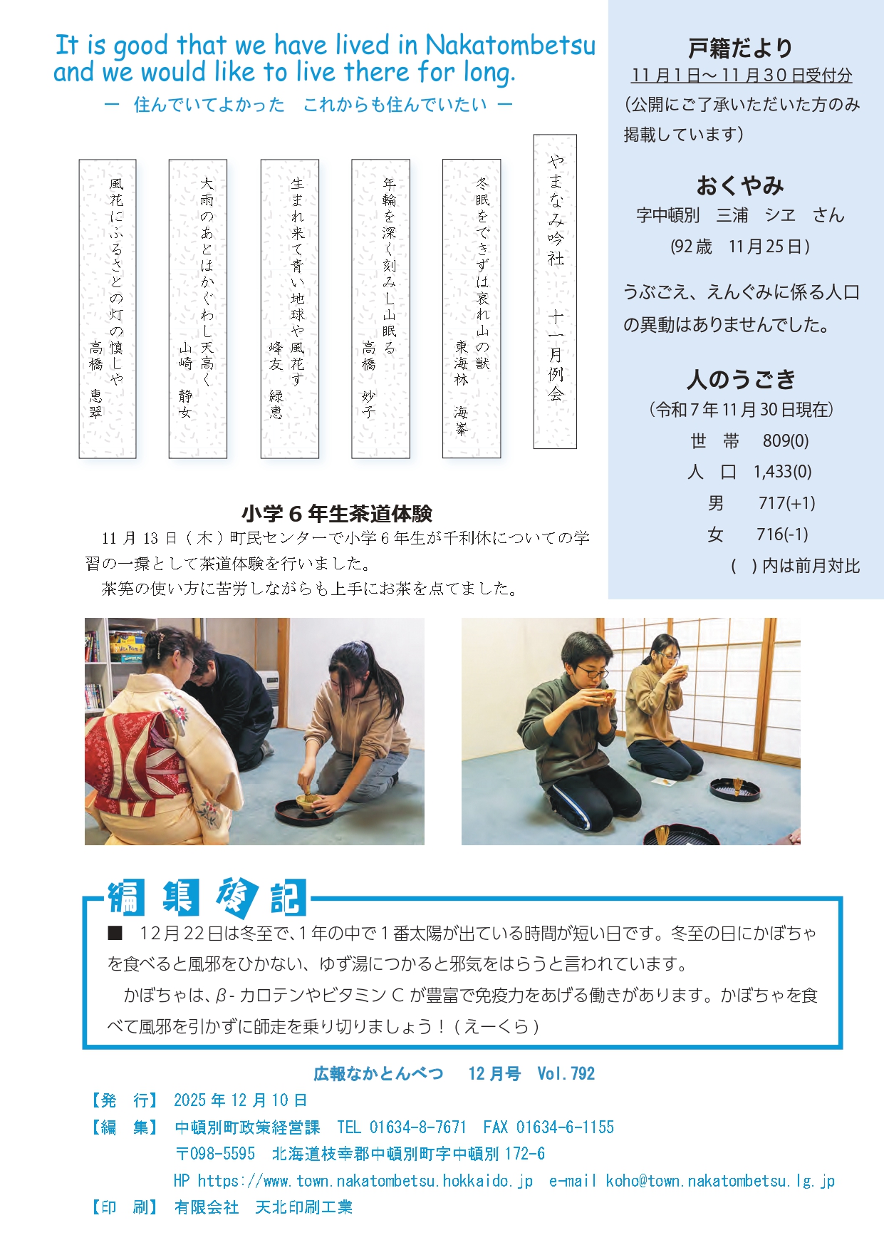 広報なかとんべつ2025年12月発行号 Home > 広報 > 広報なかとんべつ > 2025年度 広報なかとんべつ > 広報なかとんべつ2025年12月発行号 電子版はこちらから(Hokkaido ebooks) ページ 内容 広報なかとんべつ2025年12月発行号 表紙:こども園の様子 792-1 特集:子どもたちの成長を支える中頓別町の取り組み 792-2-3 まちの話題 792-4-5 インフォメーション 792-6-7 第8期総合計画 町民アイデア「7つのアクション」活動便り 792-8 ダリン&タイラーのALT通信 792-9 保健師さんの健康宅配便 792-10 図書室だより 792-11 裏表紙 やまなみ吟社 792-12 2025年度 広報なかとんべつ