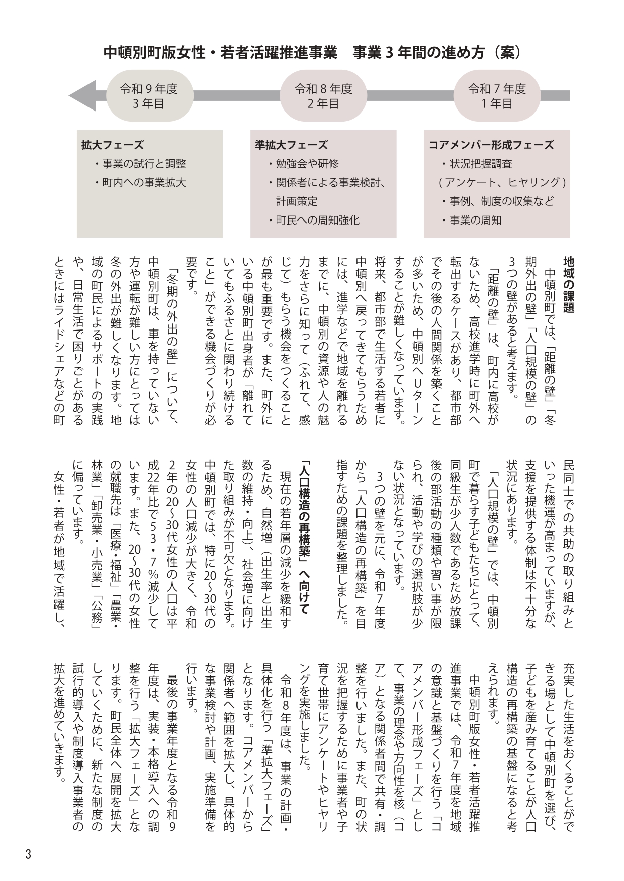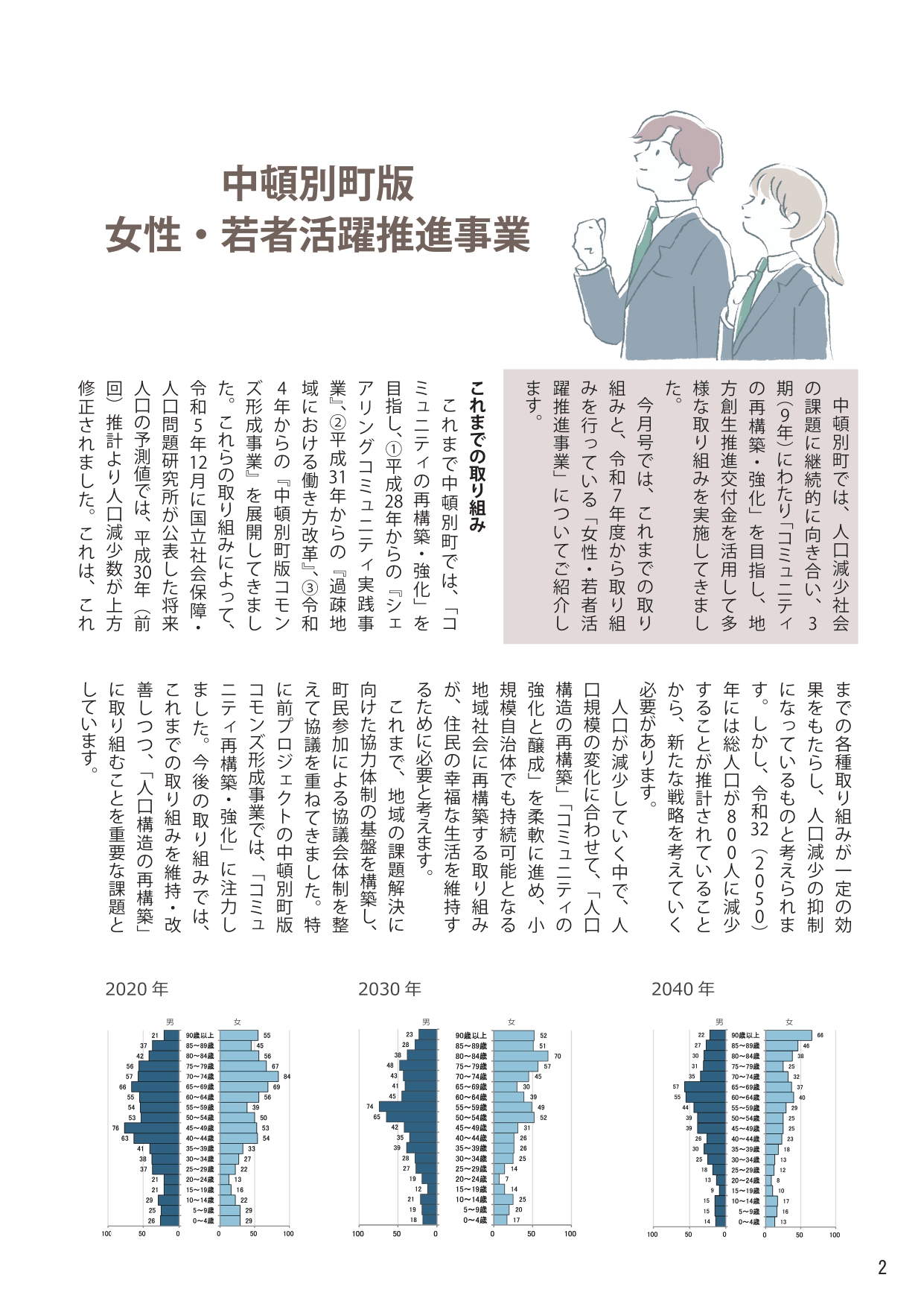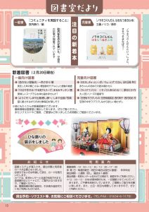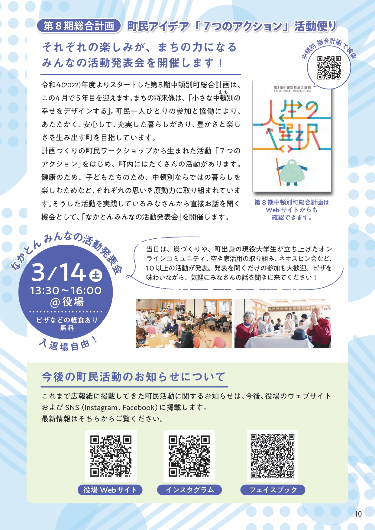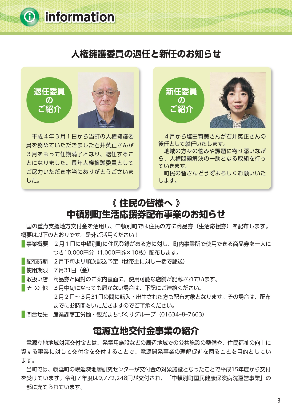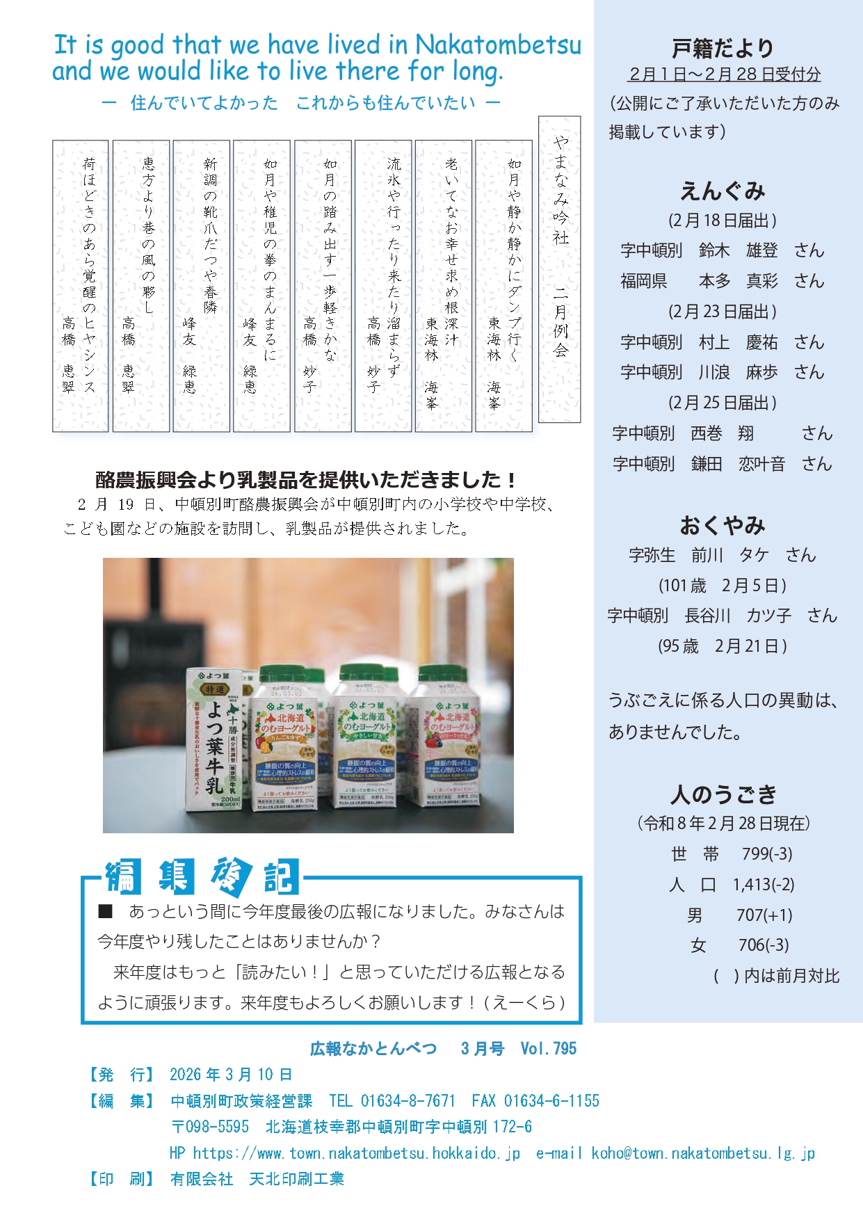 広報なかとんべつ2026年3月発行号 Home > 広報 > 広報なかとんべつ > 2025年度 広報なかとんべつ > 広報なかとんべつ2026年3月発行号 電子版はこちらから(Hokkaido ebooks) ページ 内容 広報なかとんべつ2026年3月発行号 表紙:親子つみ木教室の様子 795-1 特集:中頓別町版女性・若者活躍推進事業 795-2-5 まちの話題 795-6-7 インフォメーション 795-8-9 第8期総合計画 町民アイデア「7つのアクション」活動便り 795-10 ダリン&タイラーのALT通信 795-11 ワインづくりへの挑戦 795-12 図書室だより 795-13 裏表紙 やまなみ吟社 795-14 2025年度 広報なかとんべつ