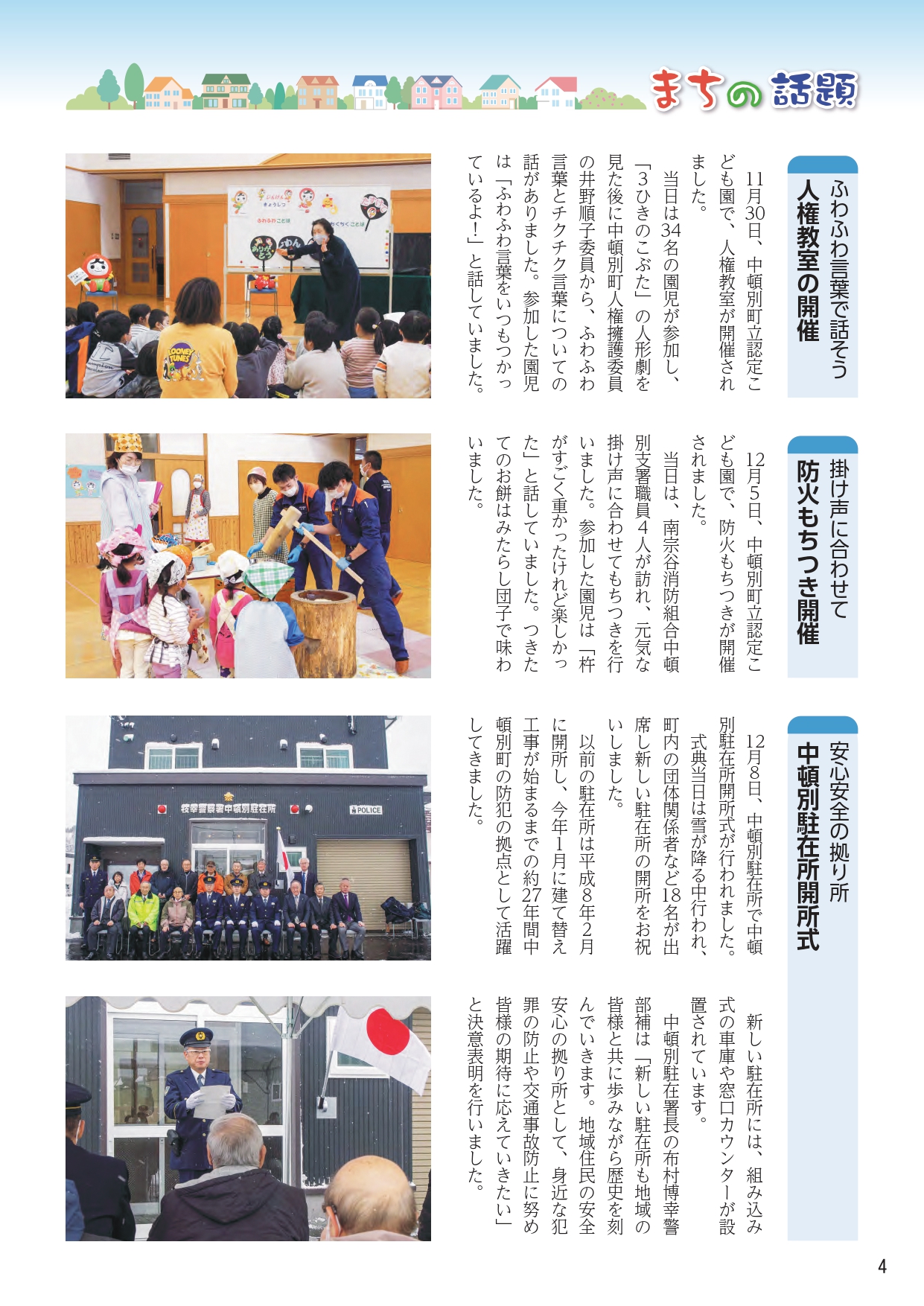 広報なかとんべつ2024年1月発行号 Home > 広報 > 広報なかとんべつ > 2023年度 広報なかとんべつ > 広報なかとんべつ2024年1月発行号 電子版はこちらから(Hokkaido ebooks) ページ 内容 広報なかとんべつ2024年1月発行号 表紙:防火もちつきの様子 769-1 特集:小林町長と星川議長より<年頭挨拶> 769-2-3 町の話題 769-4-5 インフォメーション 769-6-9 第8期総合計画 町民アイデア「7つのアクション」活動便り 769-10 ワインづくりへの挑戦 769-11 病院だより 769-12 ダリン&マギーのALT通信 769-13 保健師さんの健康宅配便 769-14 図書室だより 769-15 裏表紙 やまなみ吟社 769-16 2023年度 広報なかとんべつ