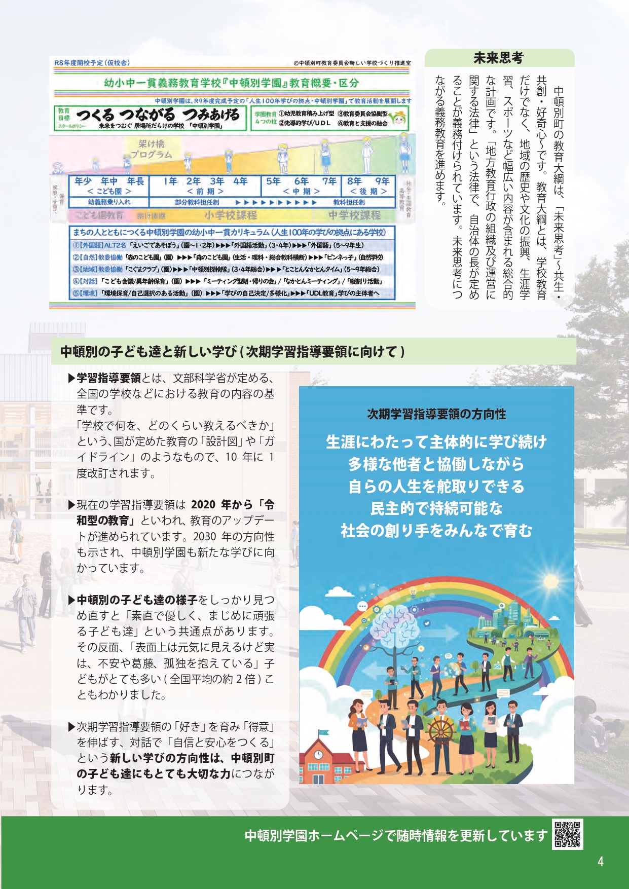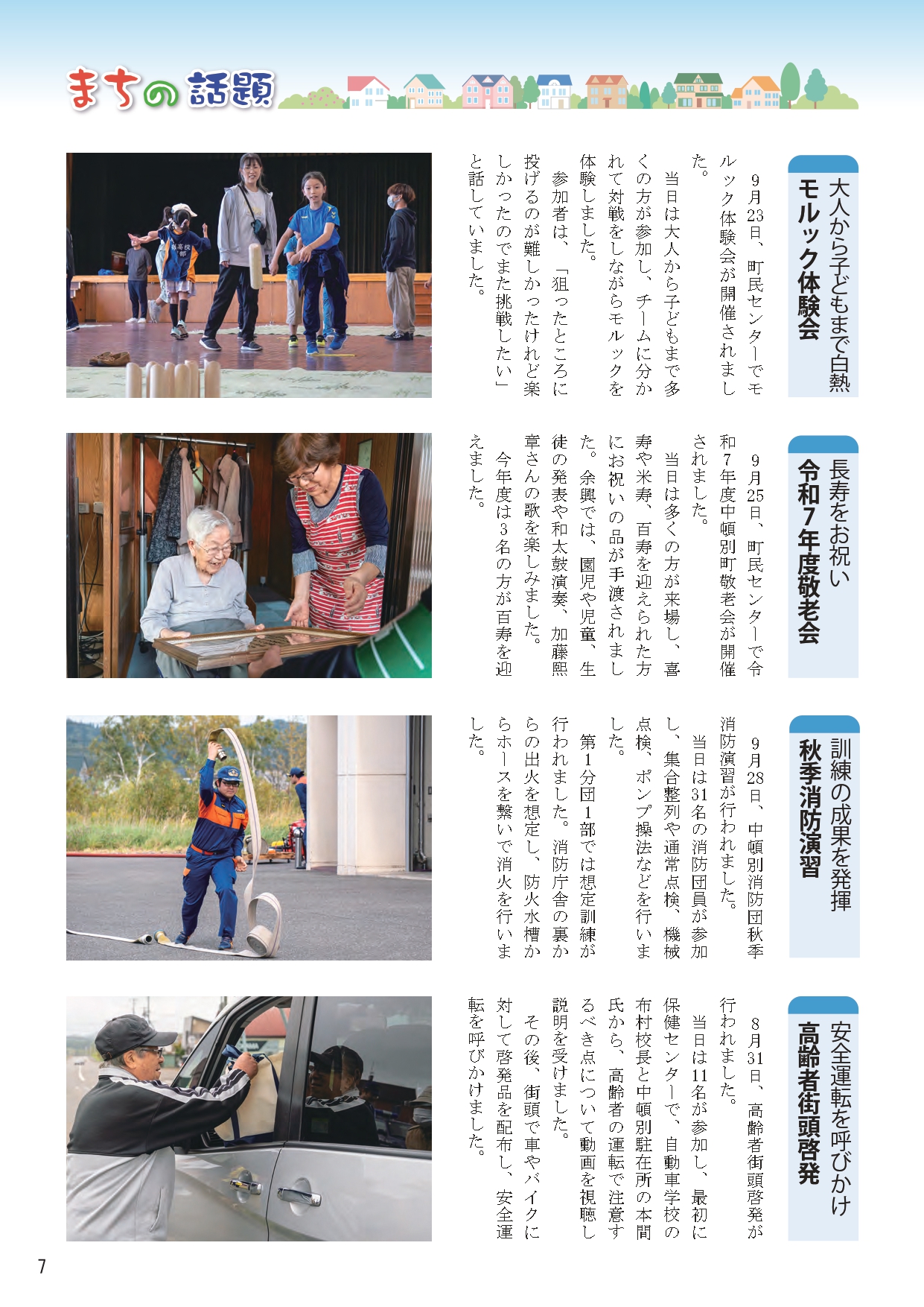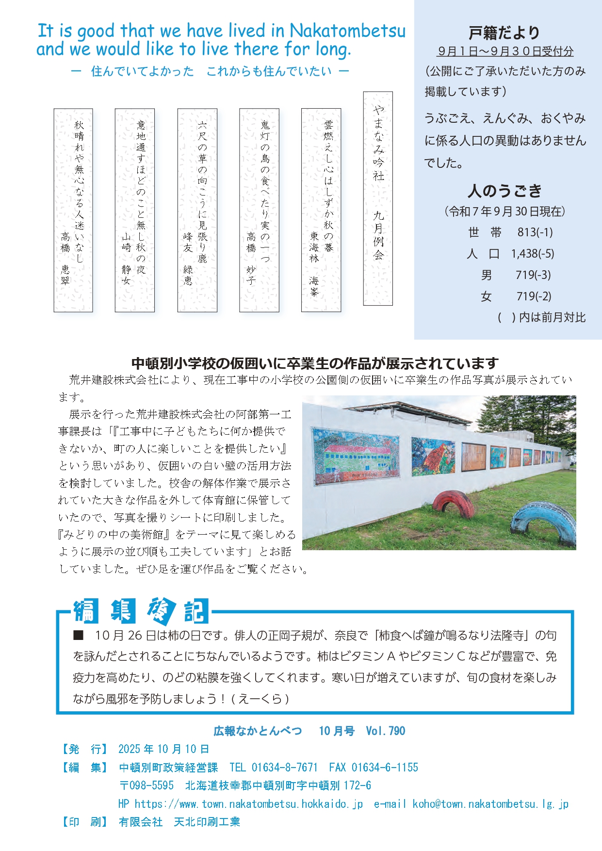 広報なかとんべつ2025年10月発行号 Home > 広報 > 広報なかとんべつ > 2025年度 広報なかとんべつ > 広報なかとんべつ2025年10月発行号 電子版はこちらから(Hokkaido ebooks) ページ 内容 広報なかとんべつ2025年10月発行号 表紙:小学4年生植樹体験の様子 790-1 特集:幼小中一貫義務教育学校「中頓別学園」 790-2-5 まちの話題 790-6-7 インフォメーション 790-8-9 第8期総合計画 町民アイデア「7つのアクション」活動便り 790-10 ダリン&タイラーのALT通信 790-11 保健師さんの健康宅配便 790-12 図書室だより 790-13 裏表紙 やまなみ吟社 790-14 2025年度 広報なかとんべつ