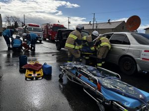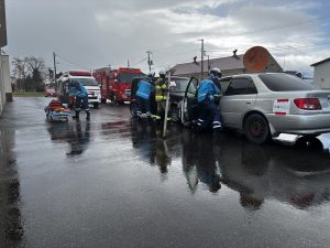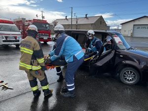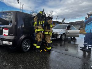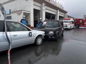 今回の訓練は、乗用車同士の正面衝突事故により車両内に閉じ込められた人がいる想定で行われ、救急隊・救助隊の連携を確認出来た訓練となりました。